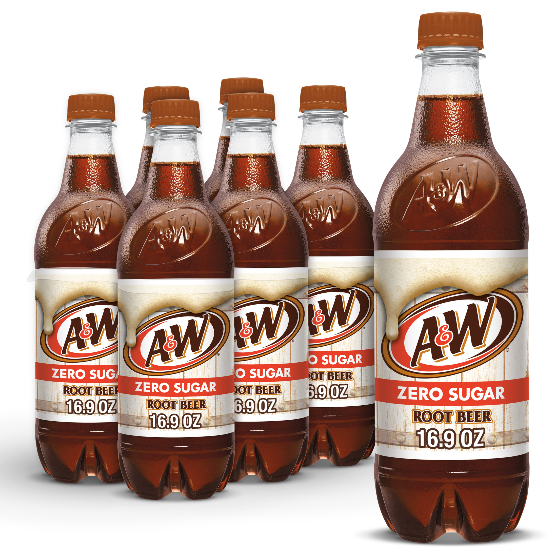 A&W Zero Sugar Root Beer Soda Pop, 16.9 fl oz, 6 Pack Bottles